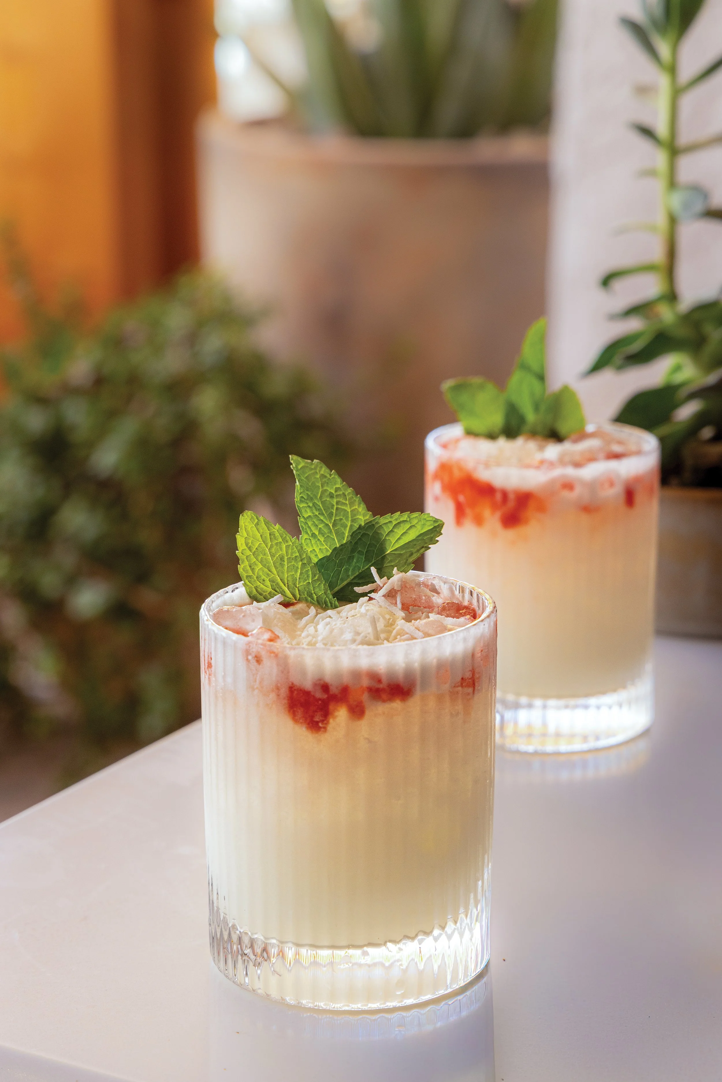 The frothy white cocktail is then topped with a touch of strawberry puree, a ripe strawberry, torched coconut shavings, and a fanned-out sprig of mint. “The mint brings a refreshing aroma, while the strawberry adds tart sweetness, and the coconut ties everything together while adding a soft, toasty finish,” Avila says.