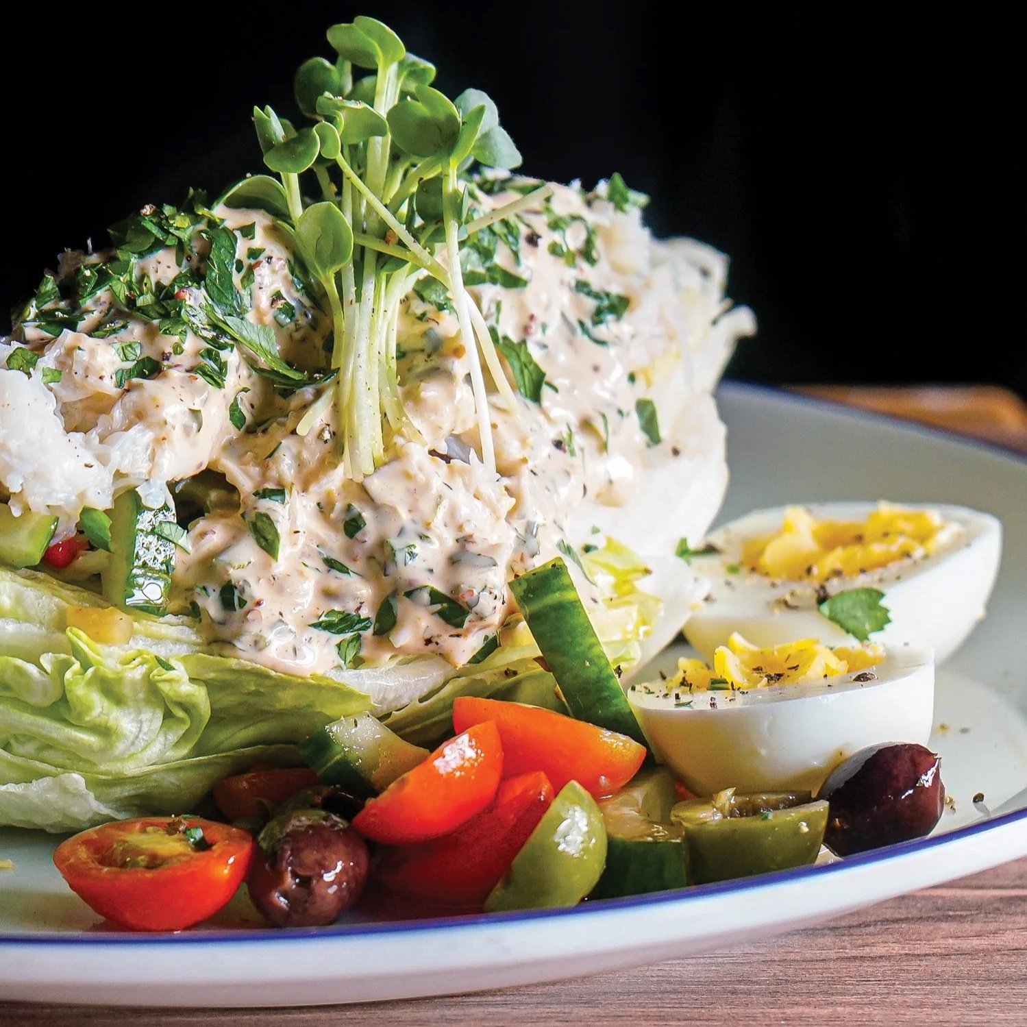 Think the classic wedge except the blue cheese and bacon are swapped for something a bit more refined. Crisp iceberg wedge serves as the foundation, topped with sweet Dungeness crab, heirloom cherry tomatoes, briny nicoise olives, sliced hardboiled egg, and cucumbers. The star is the housemade Killer Louie dressing, which is a creamy, herb-packed sauce with Creole mustard, fresh cilantro, parsley, capers, and a touch of serrano heat. It is a lighter, seafood-forward wedge that delivers big flavor without weighing diners down. $33. www.buckandrider.com.